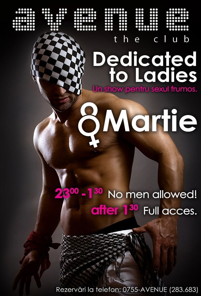În data de 8 martie, 2012, Avenue Club vă aşteaptă cu o seară specială, dedicată femeilor, cu un show extraordinar pentru sexul frumos!