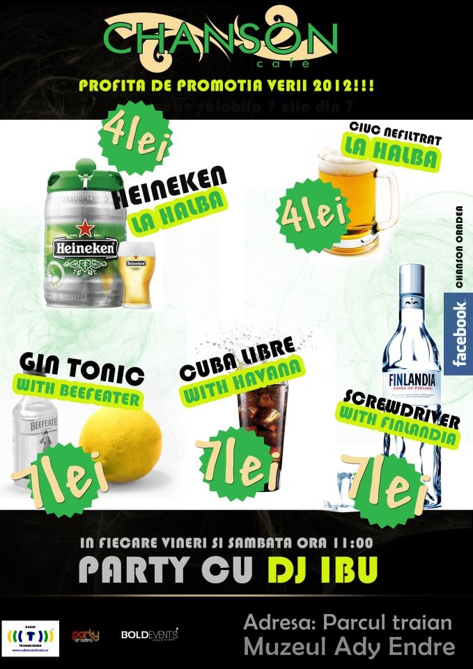 Party cu mega-promoţii, cu DJ IBU în Chanson Café - vineri şi sâmbătă de la ora 23:00.