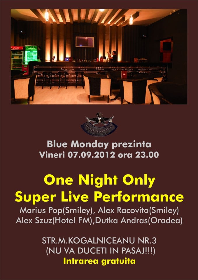 Blue Monday vă invită la super live performance "One Night Only" cu Marius Pop (Smiley), Alex Racoviţă (Smiley), Alex Szuz (Hotel FM), Dutka András (Oradea).