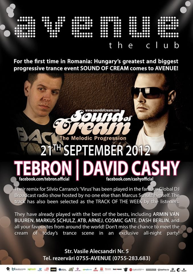 Vineri, 21 septembrie, 2012, Avenue Club: Sound of Cream Tour pentru prima oara în Romania! Tebron & David Cashy din Ungaria dau startul weekendului!