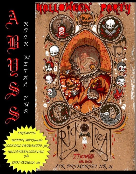 Abyss Rock Metal Pub vă aşteaptă şi în acest an la o super petrecere de Halloween cu costume trăznite, cocktail-uri surpriză şi promoţii - în data de 27 octombrie, 2012.