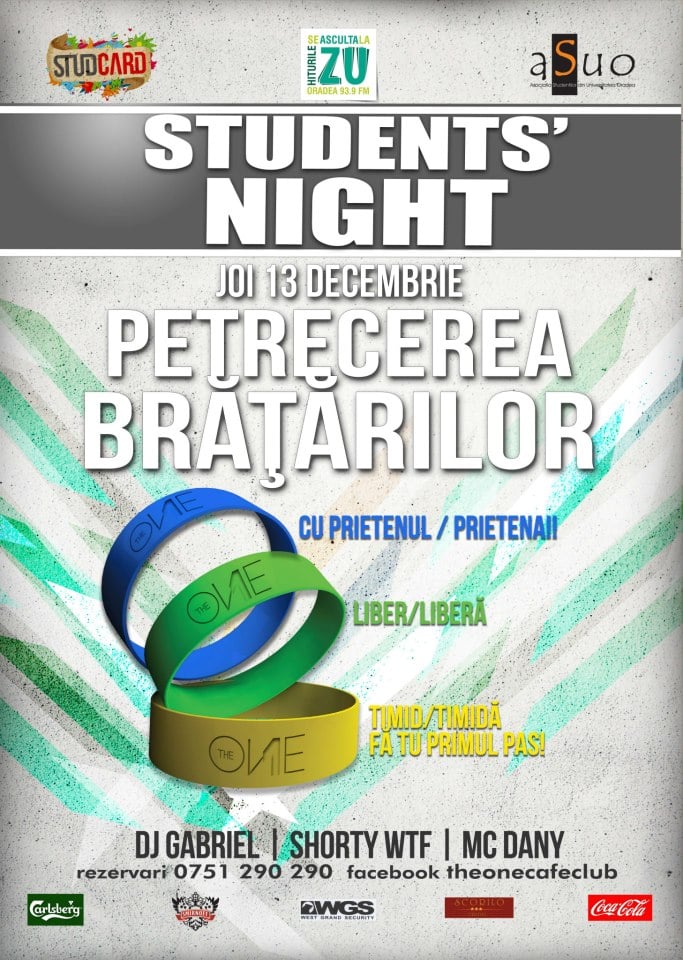 Joi seara în cadrul evenimentului Student's Night, în clubul The One Café & Club va fi organizat Petrecerea Brăţărilor cu DJ Gabriel, Shorty'wTF şi MC Dany - 13 decembrie, 2012.