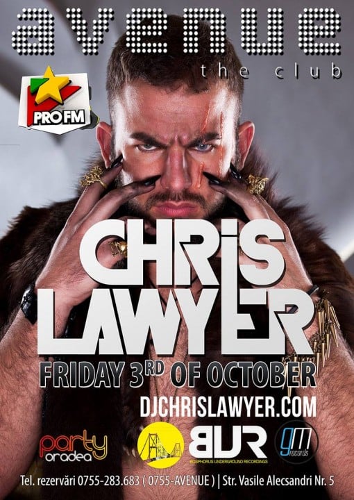PRO FM si AVENUE THE CLUB te invita la CHRIS LAWYER! Vineri 3 Octombrie, CHRIS LAWYER vine in Avenue. The Club pentru un super party! Nu rata un mega eveniment alaturi de DJ-ul maghiar de top!