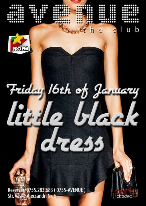 PRO FM si AVENUE THE CLUB te invita la Little Black Dress! Pregateste rochita neagra, aduna gasca de fete si fa-ti o rezervare, pentru ca vinerea asta iti e dedicata tie! Te asteapta muzica buna, distractie si multe surprize! Rezervari la tel. 0755-283.683 ( 0755-AVENUE )