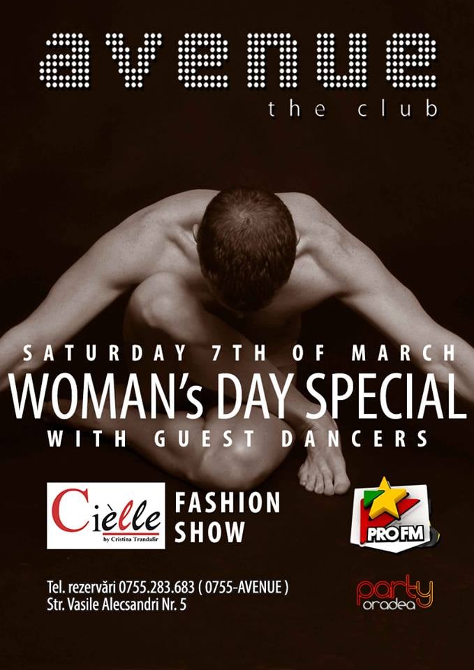 Sambata 7 Martie vino sa te bucuri de un fashion show semnat CIelle, ca mai apoi sa savurezi o petrecere de neuitat alaturi de dansatori special invitati pentru eveniment! Table booking: 0755-283.683 ( 0755-AVENUE )
