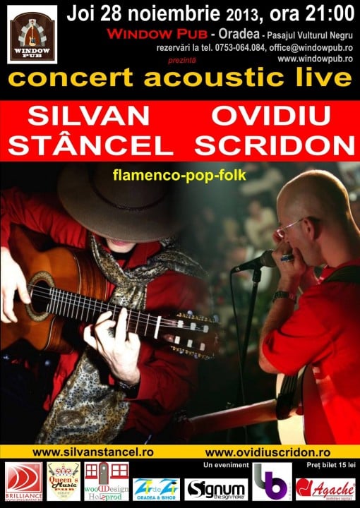 JOI, 28 NOIEMBRIE, ORA 21:00, VA INVITAM IN WINDOW PUB Silvan Stâncel & Ovidiu Scridon au fugit artistic de acasă “Pentru Ea”. Da, Ea este Muzica, pentru care cei doi ar face orice. De fapt, au făcut orice le-a stat în putinţă pentru a o câştiga de partea lor. Culmea, au reuşit! Silvan şi Ovidiu au pornit într-un turneu dedicat tuturor iubitorilor de muzică live, chitară flamenco, pop, folk sau fusion, toate acestea în combinaţie cu poezie, muzicuţe, cajon şi diverse elemente de percuţie. Fiecare concert este unic şi diferit datorită gradului mare de improvizaţie muzicală pe care cei doi artişti îl propun direct pe scenă în faţa spectatorilor. BILETELE S-AU PUS IN VANZARE LA BAR IN WINDOW PUB PRET BILET 15 LEI informatii: 0753 064 084