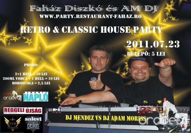 Disco Faház şi AM DJ vă invită la o petrecere Retro & Classic House Party - sâmbătă, 23 iulie, 2011. Atmosfera unică va fi asigurată de DJ Mendez şi DJ Adam Moriss.