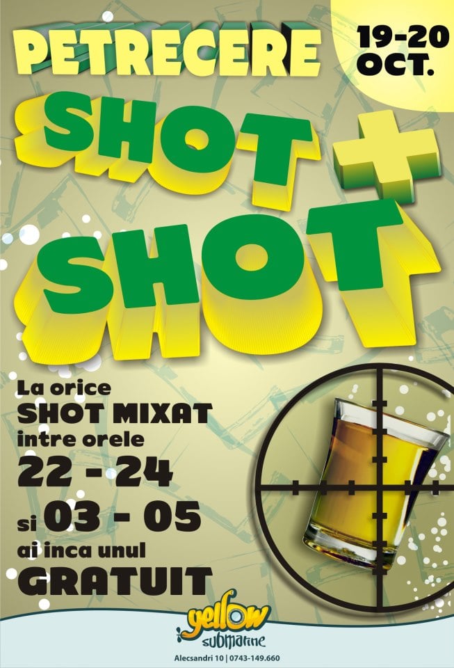 În acest weekend Yellow Submarine Cafe vă aşteaptă la petrecerea "shot + shot" cu promoţia: la orice shot mixat între orele 22-24 şi 03-05 ai încă unul gratis.