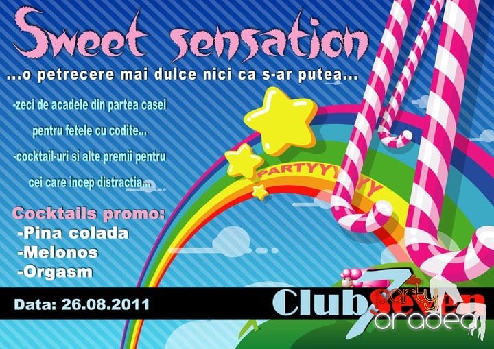 Club Seven a pregătit pentru tine o petrecere dulce în adevăratul sens al cuvântului. Te aşteaptă zeci de acadele din partea casei, în special pentru fetele care vin cu părul prins în codiţe, premii pentru cei care încep distracţia şi o menţin, de asemenea nu vor lipsi nici promoţiile la cocktailurile dulci.