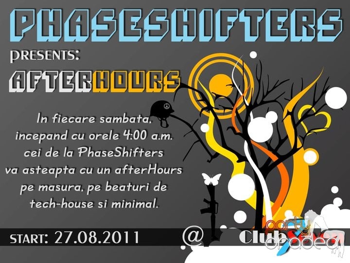 Club Seven împreună cu PhaseShifters vă aşteaptă în fiecare sâmbătă, de la ora 4:00 dimineaţa la o petrecere afterhours cu muzică tech-house, electronica, house, deep house şi minimal.