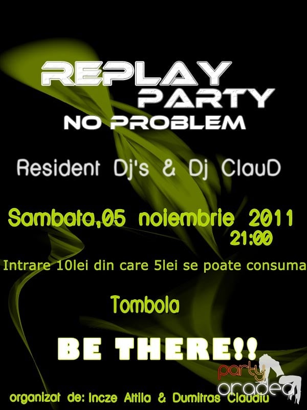 Replay Party în No Problem în data de 5 noiembrie, 2011, de la ora 21:00, cu Resident DJ's şi DJ ClauD.